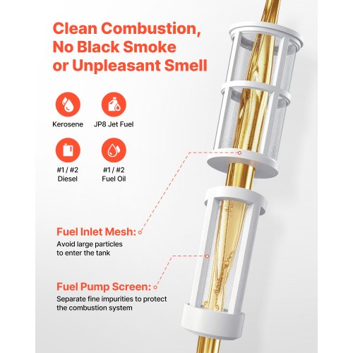 Ren förbränningsprestanda: Fotogenvärmaren har dubbla bränslefilter för renare förbränning. Kompatibel med fotogen och diesel, den minskar rök, obehaglig lukt och obehag under användning.