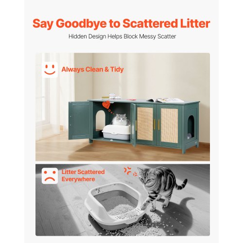 Kattlåda för flera katter, 120 cm dolt kattlådaskåp med 4 rottingdörrar och 2 ingångar, inomhuskattrum, kattmöbler i trä, passar de flesta kattlådor, grön | EU