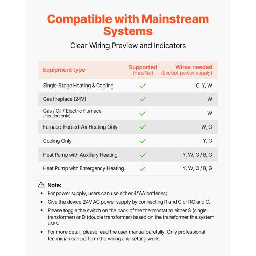 Kompatibla system: Denna termostat fungerar med golvvärme, snösmältning, AC, värmepumpar, gas- och vattenvärmesystem, och använder golv-/inomhussensorer för temperaturkontroll. (Kräver torrbatteri eller 24V-ledningar)