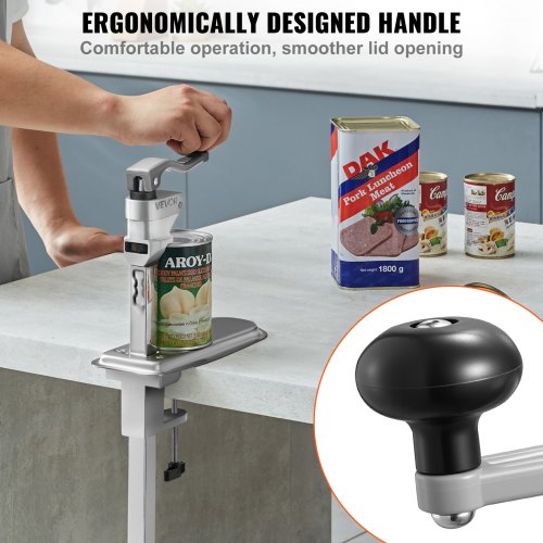 Lätt att använda: För att använda denna kraftiga konservöppnare, placera bara burken, justera höjden, sänk bladet och handtaget och rotera. Det ergonomiska handtaget ger ett bekvämt grepp för smidigare användning.