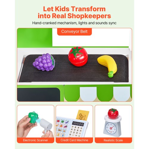 Interaktive Funktionen: Unser Spielzeug-Lebensmittelladen ist mit einem laufenden Förderband, einem Scanner und einem Kartenleser ausgestattet, sodass Kinder Obst und Gemüse scannen und an der Kasse bezahlen können, genau wie in einem echten Laden.