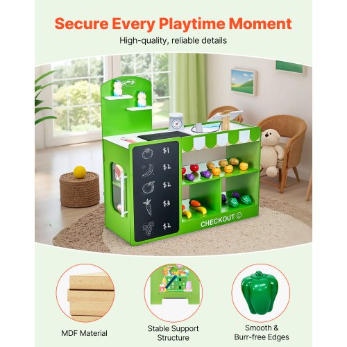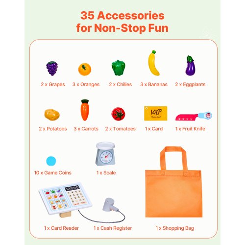 35 Premium-Zubehörteile: Das Kinderspielset enthält eine Registrierkasse, eine Waage, Einkaufstaschen und 20 Obst- und Gemüseteile – perfekt für ein immersives Spielerlebnis.