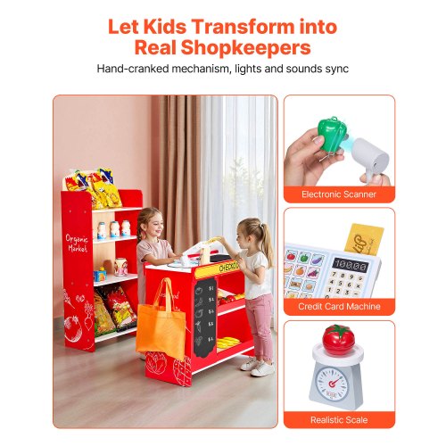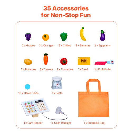 35 Premium-Zubehörteile: Das Kinderspielset enthält eine Registrierkasse, eine Waage, Einkaufstaschen und 20 Obst- und Gemüseteile – perfekt für ein immersives Spielerlebnis.