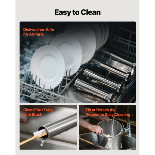 Enkel rengöring: Vår korvfyllningsmaskin har löstagbara delar som pipa, kolv och rör, alla diskmaskinssäkra. Det rostfria stålet är lätt att torka rent. Perfekt för hemmet, företaget, jakten eller husdjursfoder, och även en omtänksam present.
