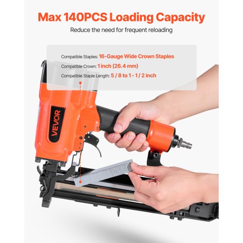 Hög laddningskapacitet: Den luftdrivna häftpistolen har ett laddningsmagasin med stor kapacitet som rymmer upp till 140 klammer åt gången, vilket säkerställer effektivt arbete utan frekvent omladdning. Aluminiumlegering ger hög hållfasthet och hållbarhet.