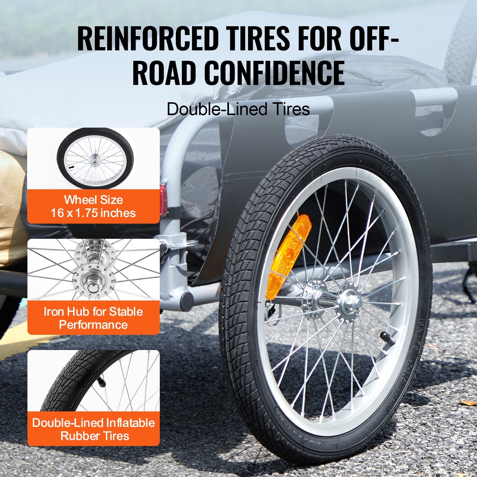 Professional Tire Design: Roll smoothly on any road! Our bike trailer is equipped with sporty 16" x 1.75" tires and iron hubs, which provide excellent stability and grip on various surfaces, whether you're cruising on concrete, navigating gravel roads, or tackling sandy trails.