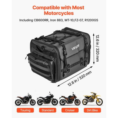 Passar de flesta motorcyklar: Denna bakväska för motorcyklar är utformad för att passa de flesta motorcyklar, inklusive touring-, standard-, cruiser- och dirt bikes. Den installeras snabbt med fyra remmar som fästs under baksätet, vilket ger ett stabilt och halkfritt grepp.