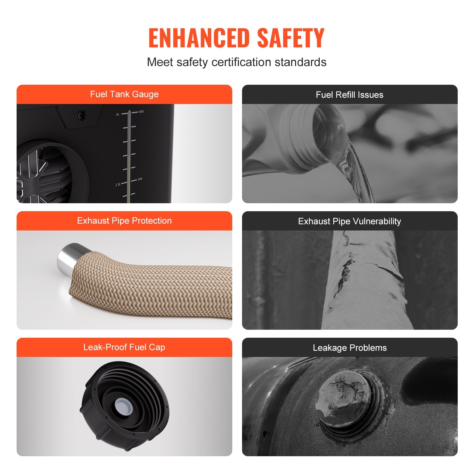 Innovative CO Alarm System: Our diesel heater features enhanced safety with a built-in CO alarm that continuously monitors CO levels, providing warnings or automatic shutdown when necessary. Additional upgrades include a leak-proof fuel tank cap, fuel level indicator and overheating protection – ensuring peace of mind during extended use.