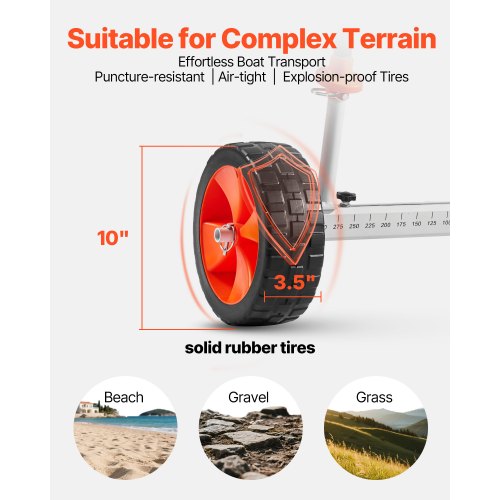 Smidig åktur: Utrustad med 10-tums solida PU-hjul och 3,5-tums breda däck glider denna kajakvagn lätt över sand, grus och gräs. Ingen luft behövs – njut av en problemfri och underhållsfri upplevelse i alla terränger.