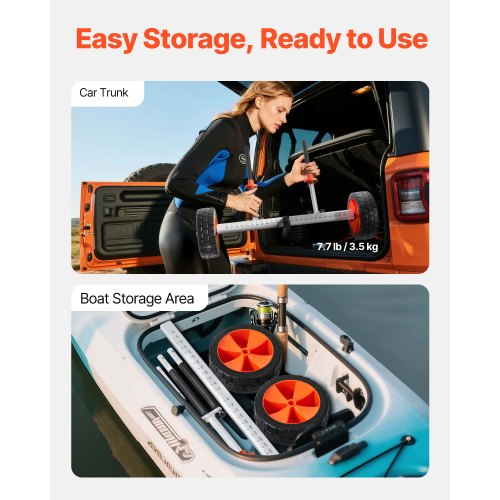Hopfällbar och kompakt: Den lätta, avtagbara designen gör den enkel att bära med en hand. Paddleboardvagnen får bekvämt plats i din SUV:s bagageutrymme eller båtförvaring, perfekt för enkel transport eller snabb förvaring när den inte används.
