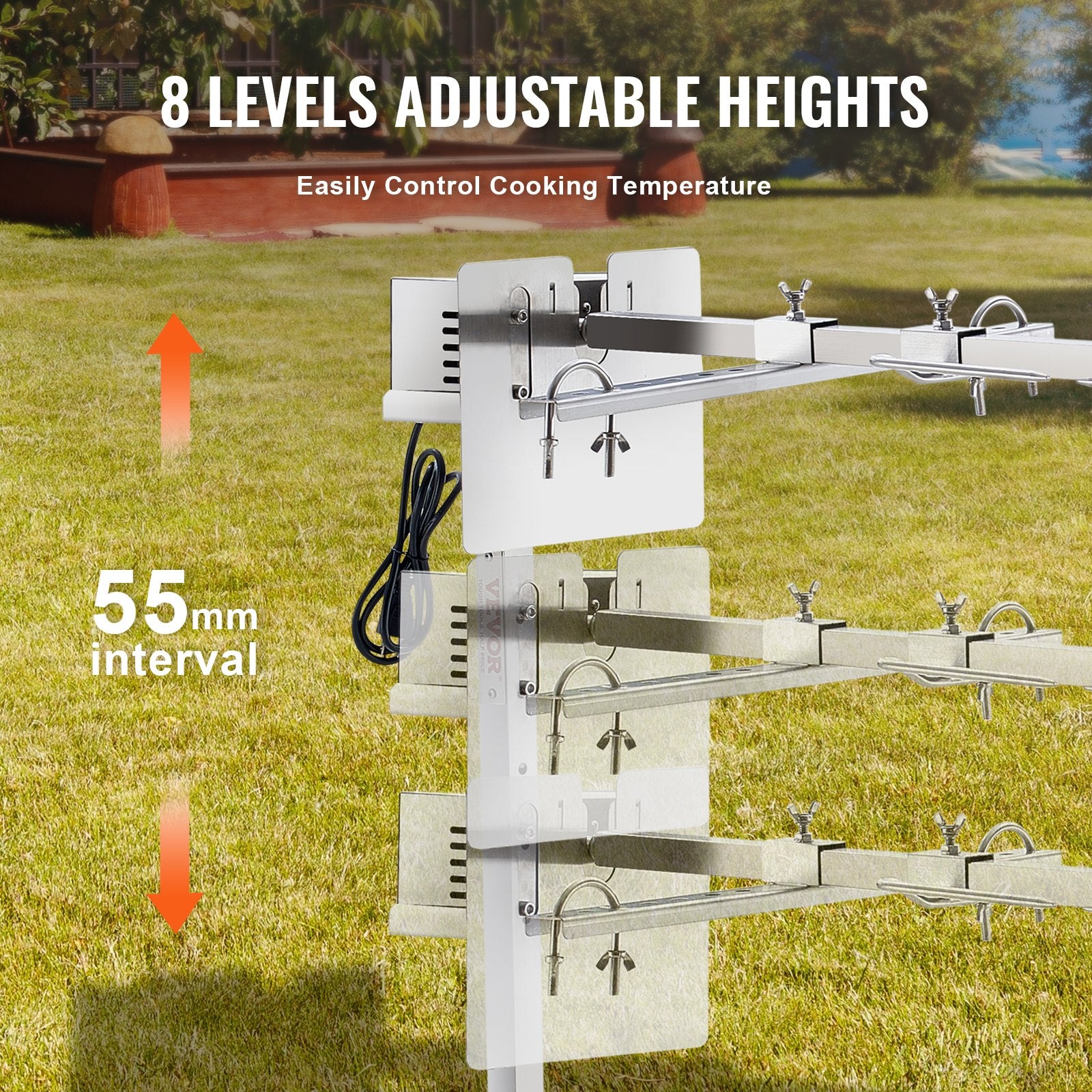 Adjustable Heights: Designed with 8 different height holes, the skewer system can be easily adjusted. The skewer grill set is designed to control the cooking temperature. The upgraded 45-degree stand ensures stability even on grass.