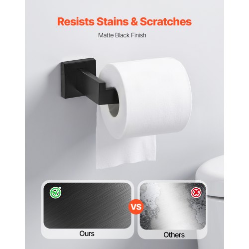Elegant design: Med en minimalistisk fyrkantig form och premium mattsvart finish är dessa badrumsdetaljer motståndskraftiga mot fläckar och repor för långvarig skönhet. De avfasade kanterna skyddar dig från oavsiktliga repor, medan dess tidlösa stil kompletterar en mängd olika badrumsinredningar med elegans.