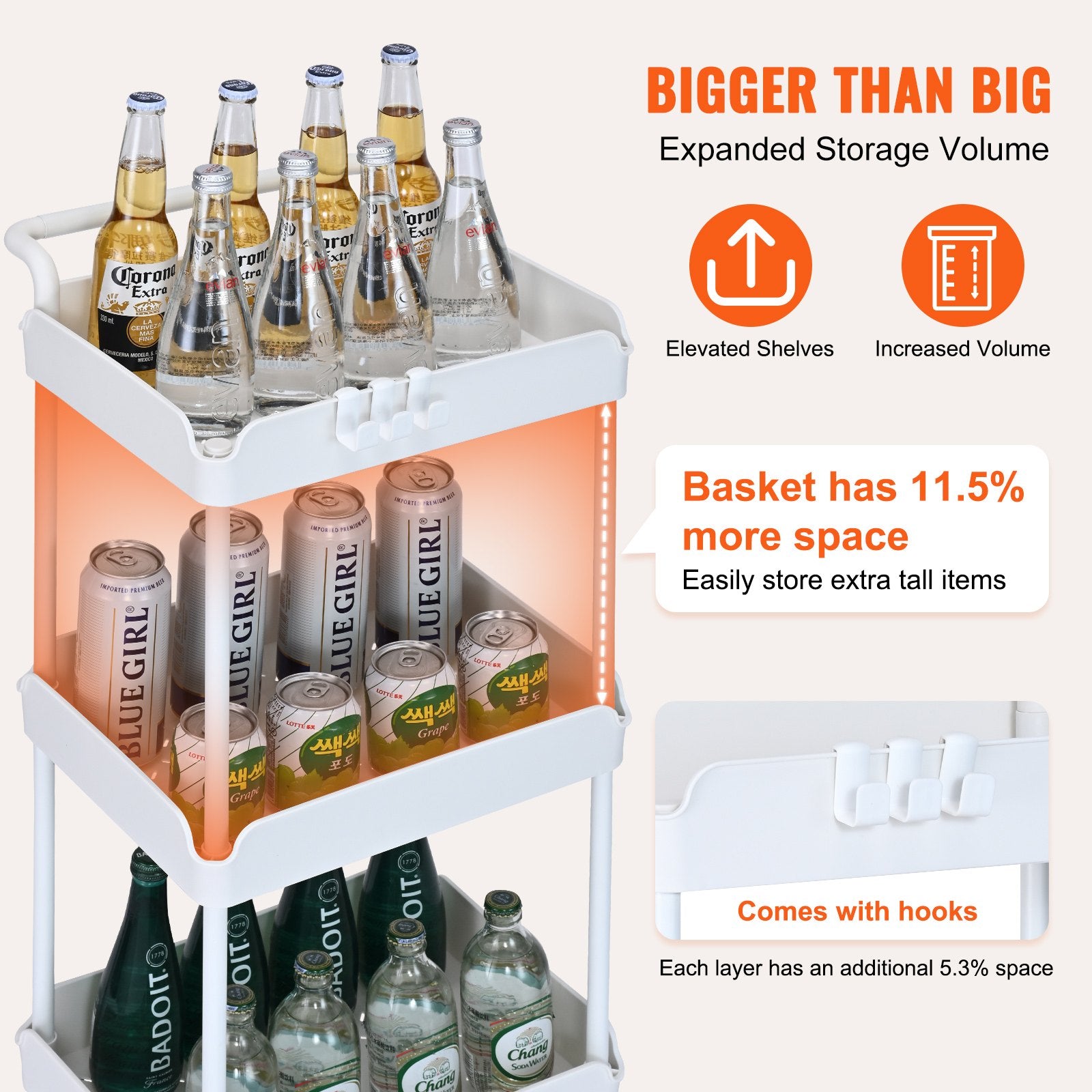 Increased Capacity: Experience expanded storage space with our newly upgraded rolling cart! With an increase in height, each shelf provides 5.3% more space with 11.5% more basket space. Whether it's bulky items or small knick-knacks, you can store them all. Plus, extra hooks mean more hanging space – talk about convenience!