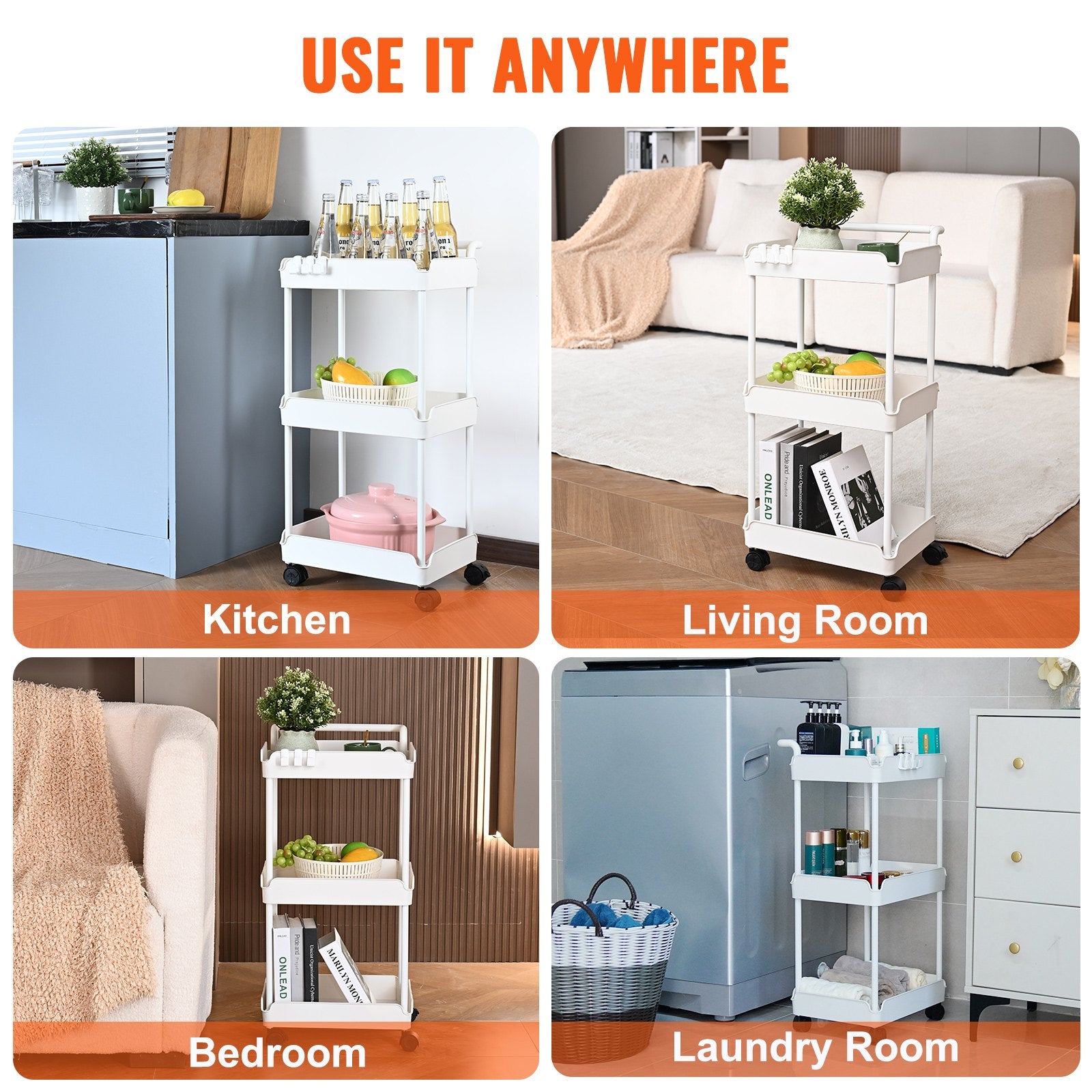 Lockable Swivel Casters: Push your rolling storage cart wherever you need it with our 360-degree lockable casters, making it easy to use in tight spaces. If you want it in one place, just lock the casters. And with sturdy PP material, you're promised a smooth ride every time.