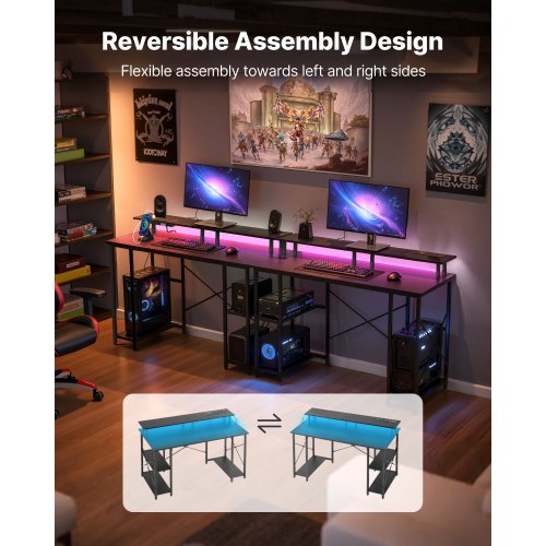 120 cm datorskrivbord med smarta LED-lampor och eluttag, vändbart spelskrivbord med skärmstativ och förvaringshyllor i två nivåer, studiematerial för hemmakontor, svart | EU