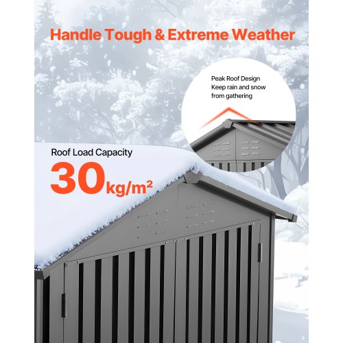 Snow and Water Resistant: Designed with a peaked roof, this garden shed helps prevent snow and water accumulation. It can withstand up to 30 kg/m², ensuring the roof remains intact despite heavy snow, water or debris. Built for long-term durability, it remains stable and reliable for outdoor use.