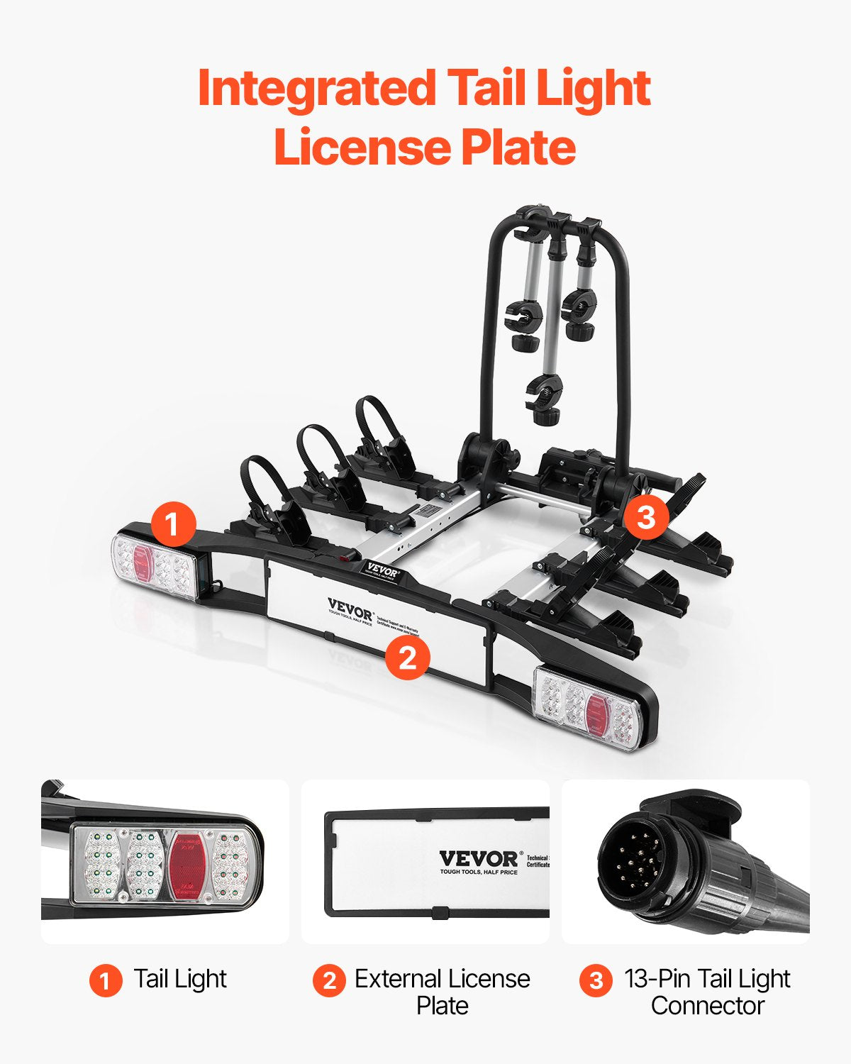 Taillight & External License Plate: Our bike rack features a 13-pin connector and can be easily integrated with your vehicle's signal lights. The highly visible external license plate improves nighttime visibility and ensures compliance with legal requirements.