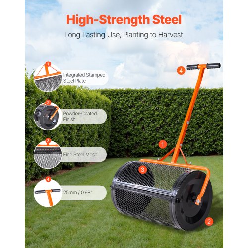Stor trumma: Den 60 cm stora torvmosselvälten rymmer upp till 1,2 kubikfot material, vilket minskar behovet av frekvent påfyllning. Fyll den en gång med gräsfrön, kompost eller jordförbättringsmedel för att täcka stora ytor snabbt och enkelt.