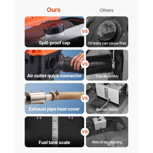Säkerhetsfunktioner: Denna dieselluftvärmare är uppgraderad med CO-larm, avgasrörsvärmehylsa och förseglat tanklock för säker långvarig användning. Internt kort inkluderar överhettningsavstängning (≥140°C), polvändning och överspänningsskydd