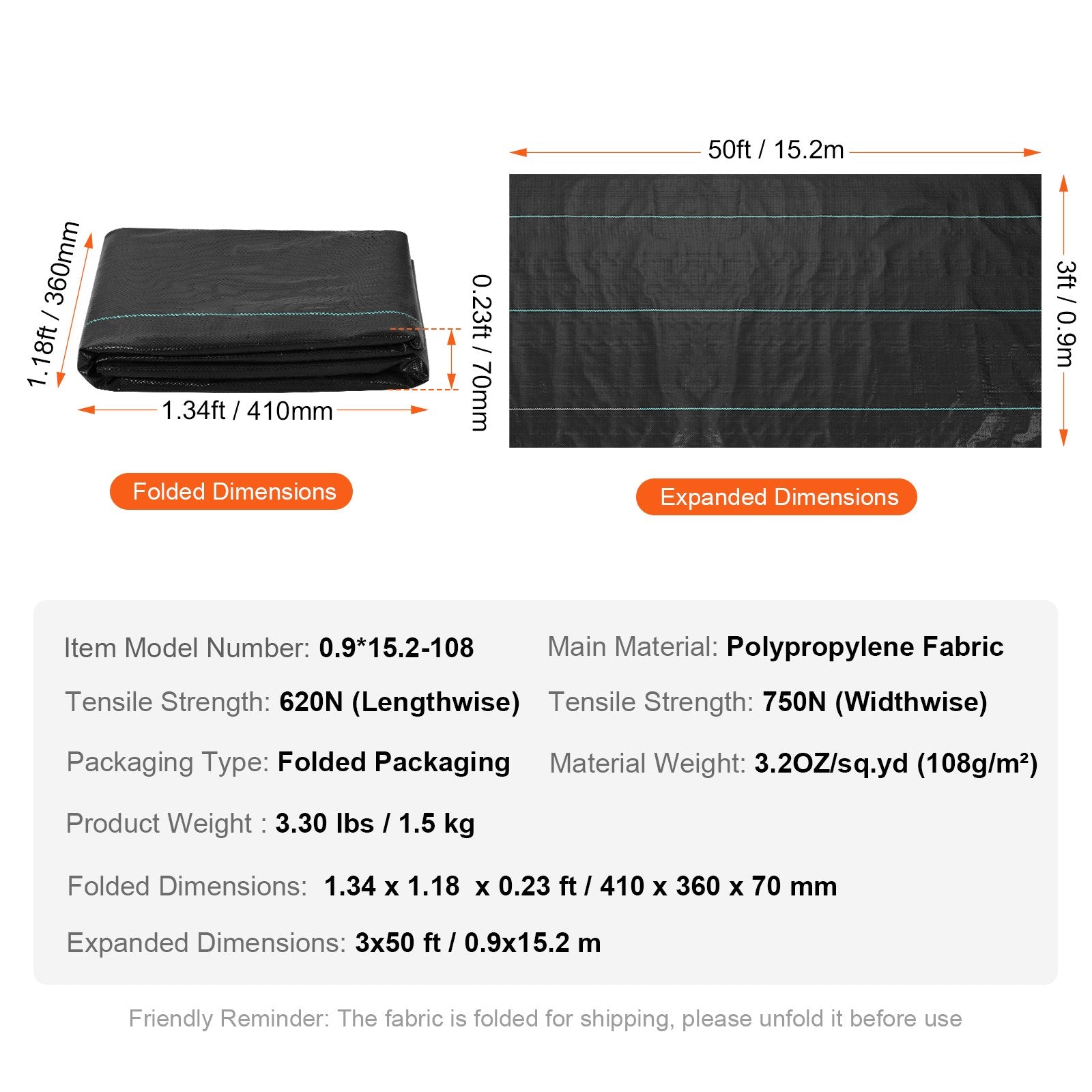 Heavy Duty Weed Barrier Fabric: Made of 3.2 OZ high density, tear and corrosion resistant polypropylene, VEVOR 3 x 50FT woven weed barrier landscape fabric is the preferred choice for agriculture and industry. It ensures superior weed prevention and promotes soil health, keeping your landscaping weed free for a longer period.