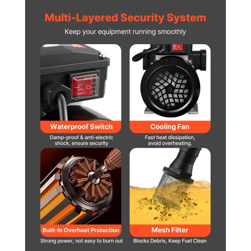 Snabb bränsleöverföring på 16 GPM: Denna bränsleöverföringspump levererar ett maximalt flöde på 16 GPM (60 L/min), ett maximalt sug på 2,4 m och ett maximalt lyft på 13,7 m. Perfekt för tankning av tunga maskiner, stora bränsletankar och utrustning på byggarbetsplatser.