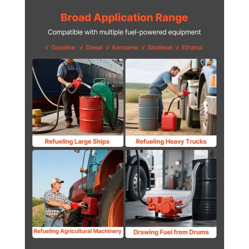 Bred dieselkompatibilitet: Utformad för bensin, diesel, fotogen och biodiesel. Denna dieselbränsleöverföringspump stöder olika dieseldrivna utrustningar som lastbilar, grävmaskiner, traktorer, jordbruksmaskiner, generatorer med mera.