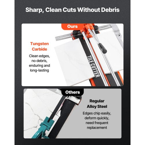 Precis skärning: Få exakta snitt med kakelskäraren. Det glidande huvudet med metallkanter och kullagerdesign säkerställer smidig skärning, vilket möjliggör exakt kakelskärning. Utrustad med skala och vinkellinjaler för noggrann mätning och positionering.