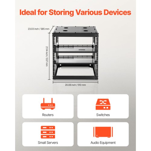 10U nätverksrack med öppet ramverk, 585 mm djup, väggmonterat eller golvstående serverrack, kraftigt 4-pelare, med ventilerade hyllor och monteringsdetaljer, rymmer all din nätverks-IT-utrustning och AV-utrustning | EU