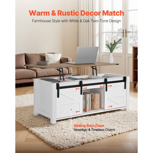 1200 mm lyftbart soffbord i lantlig stil, rustikt mittbord med ladugårdsdörr och dolt förvaringsfack, modern rektangulär lyftbar bordsskiva för vardagsrum, kontor, hem, enkel montering, vit | EU
