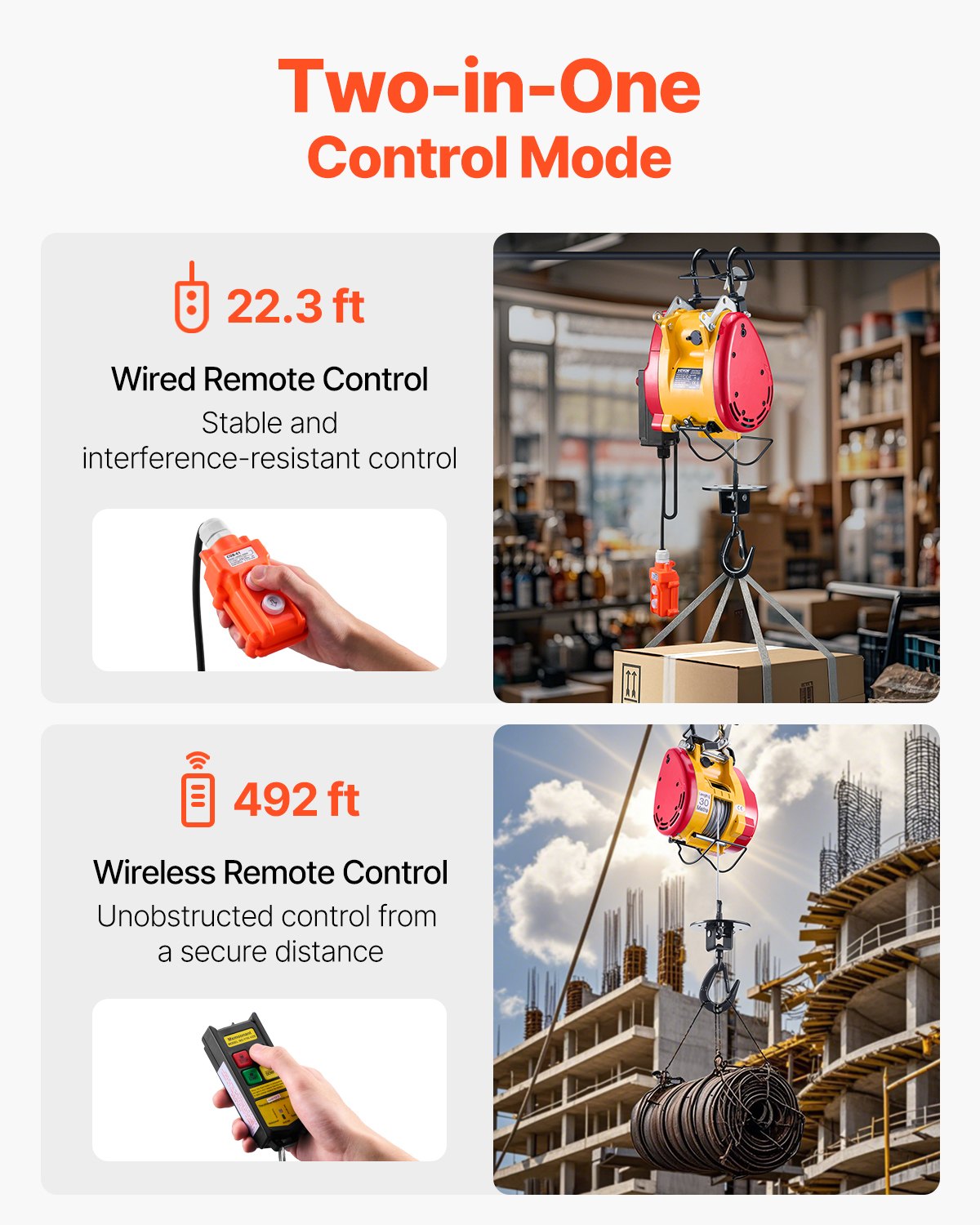 2-in-1 Flexible Operation: Our electric winch is equipped with a 22.3 ft wired control for precise close-range operations, it is ideal for warehouse and workshop use. It also includes a 492-656 ft wireless remote control for high-altitude work.
