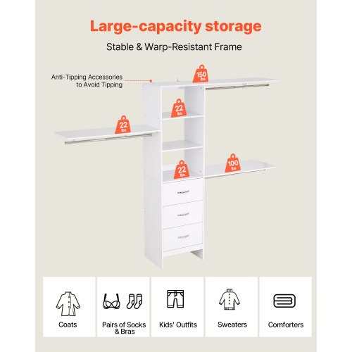 Stor kapacitet: Detta garderobssystem med lådor klarar upp till 362,7 kg och rymmer cirka 100 plagg. Använd facken för att separera föremål snyggt, så att allt är synligt och lättåtkomligt.