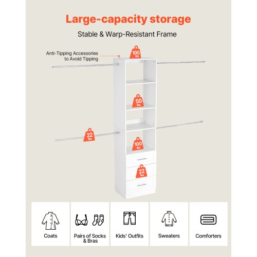 Stor kapacitet: Detta garderobssystem med lådor klarar upp till 362,7 kg och rymmer cirka 100 plagg. Använd facken för att separera föremål snyggt, så att allt är synligt och lättåtkomligt.