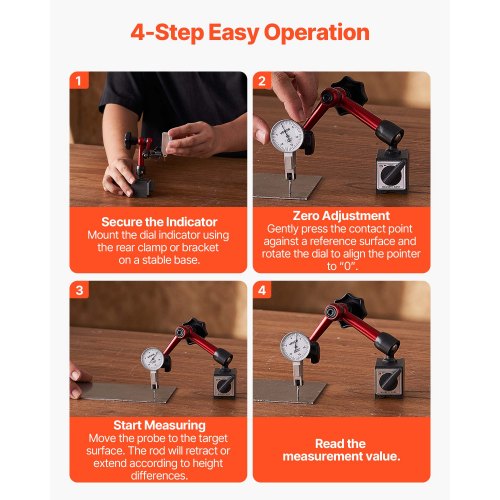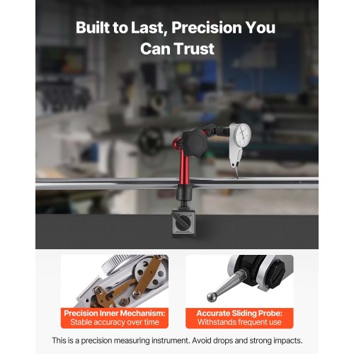 Stabilt stöd: Utrustad med ett mikrokuljusteringshandtag för millimeterfinjustering, fästs den magnetiska basen snabbt på metallytor. Idealisk med en mätklocka för exakta uppgifter som att upptäcka spill eller justering av spelrum