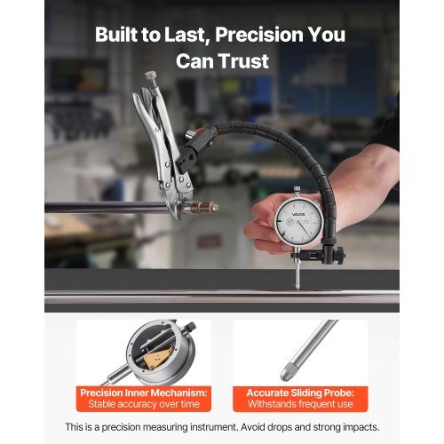 360-graders flexibel arm: Det flexibla stativet möjliggör justering i alla vinklar, medan låstänger fäster vid rör, ramar eller icke-metalliska ytor. Kombinerat med en mätklocka anpassar den sig till trånga utrymmen och ojämna arbetsstycken för mätning