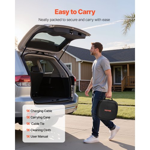 Levereras redo att användas: Vår förlängningskabel för elbilar inkluderar en bärväska för prydlig förvaring, en rengöringsduk för att hålla kontakterna dammfria och ett buntband för enkel sladdhantering – allt du behöver i ett kit