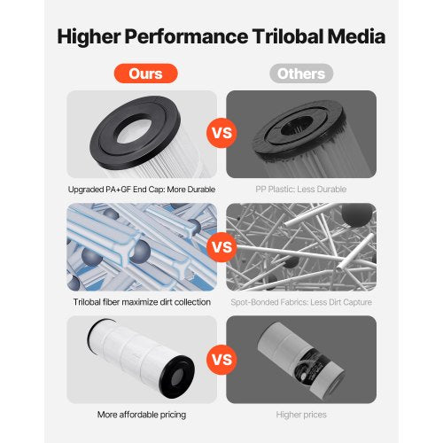 High-efficiency filtration performance: Made of high-quality trilobal fiber filter material, the hot tub filter offers exceptional dirt-holding capacity, improves the system's backpressure stability, and deeply cleans contaminants. Its high-permeability structure reduces flow resistance, ensuring efficient pump operation. The reinforced end caps and central support structure enhance the durability of the system.
