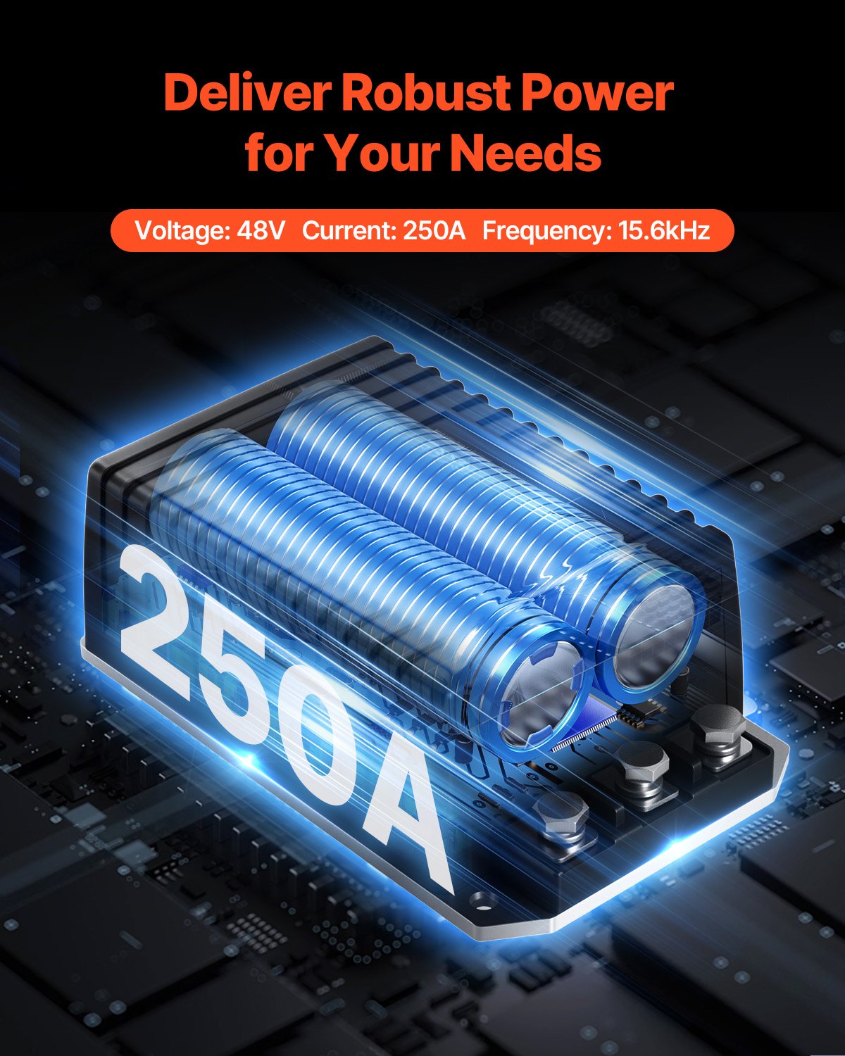 Stable Performance: With 48V and 250A output, this golf cart motor controller delivers smooth, steady power to the motor. 15.6kHz high-frequency regulation and quick start function improve efficiency and sensitive acceleration. It supports stepless speed adjustment and reverse braking for precise and seamless driving