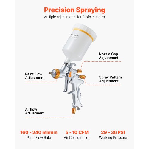 Flexibla justeringar: Med ett 360° roterande munstyckslock och tre oberoende vred för sprutmönster, färgflöde och luftmängdjustering ger denna sprutpistol med självtrycksmatning exakt kontroll för att passa olika sprutbehov.
