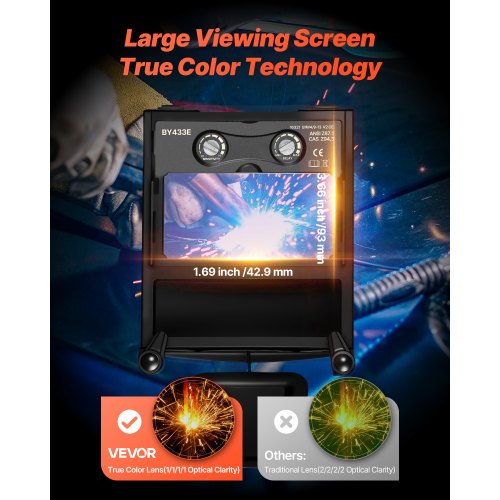 Färggenomgång: Med en stor skärm på 93 x 43 mm (3,66 x 1,69 tum), uppgraderad färggenomgångsteknik och 1/1/1/1 optisk klarhet ger VEVOR-svetshjälmen dig en tydlig, skarp och naturlig vy för säkrare och mer exakt svetsning.