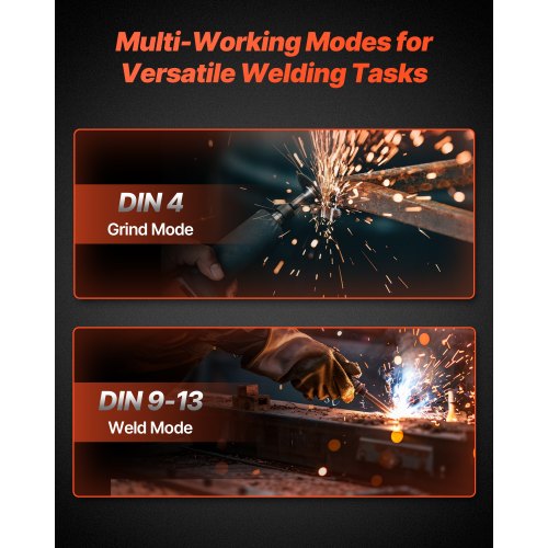 Justerbart färgomfång: Vår svetsmask i naturlig färg har justerbara DIN-färgomfång — DIN 4 (slipläge) och DIN 9–13 (svetsläge). Växla enkelt mellan arbetslägen för att förbättra effektiviteten och säkerheten vid svetsning och slipning.