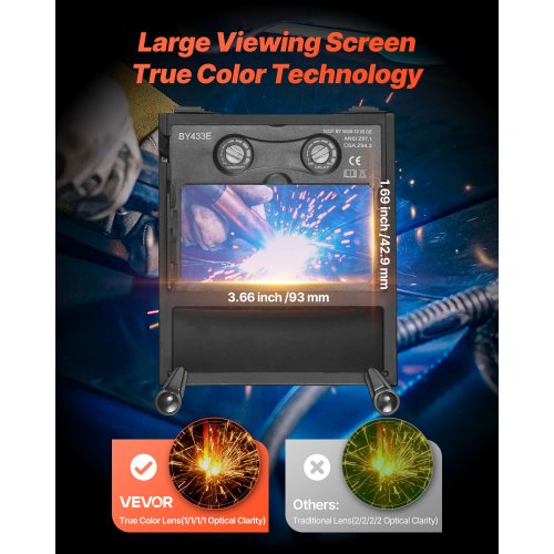 Färggenomgång: Med en stor skärm på 93 x 43 mm (3,66 x 1,69 tum), uppgraderad färggenomgångsteknik och 1/1/1/1 optisk klarhet ger VEVOR-svetshjälmen dig en tydlig, skarp och naturlig vy för säkrare och mer exakt svetsning.