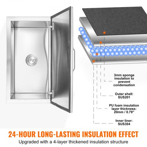 Food-grade materials: The entire ice box is made of stainless steel (top lid + interior SUS304, exterior SUS201), making it durable and rust-resistant. The interior uses an integrated full-welding process, which greatly reduces the risk of leaks.