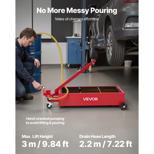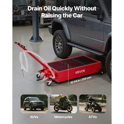 Lågprofildesign: Den ultralåga designen på det rullande oljetråget passar enkelt under låga bilar, motorcyklar och fyrhjulingar utan att använda domkraft. Du kan börja tömma snabbt, även i trånga utrymmen.
