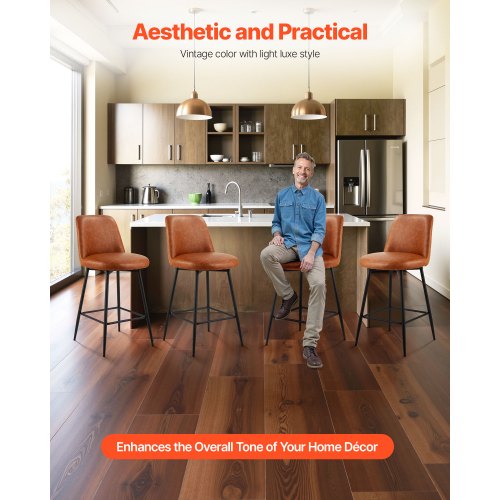 Lätt lyx och mångsidighet: Det vintagebruna PU-lädret i kombination med det strömlinjeformade, böjda ryggstödet, lämpligt för både hem och kommersiella utrymmen. Standardsitthöjden passar olika vanliga bardiskar och köksöar.