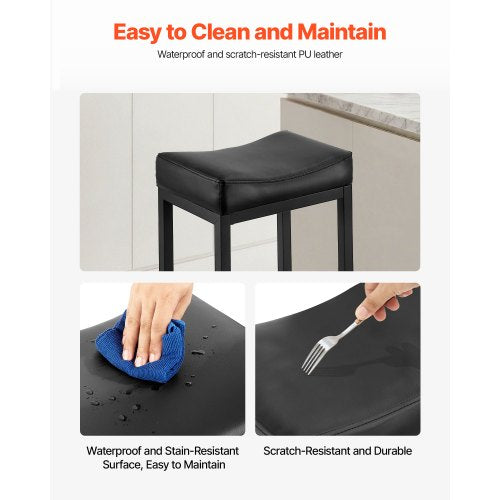 Barstolsset med 2, PU-läder, barstolar med bänkhöjd, 62 cm barstol med sadelsits och metallben, enkel montering, rygglös barstol, barö för kök, matsal, café, svart | EU