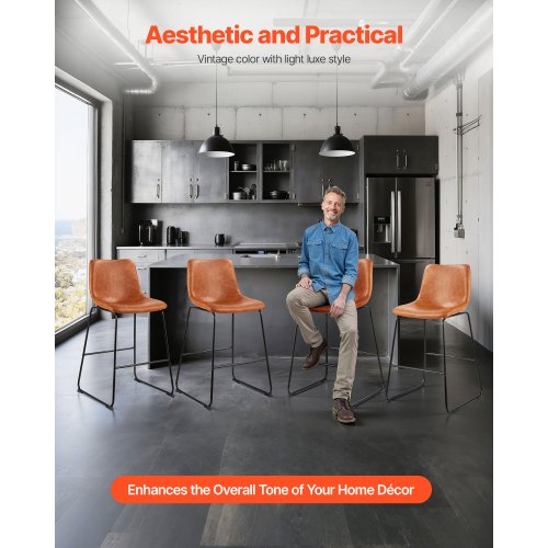 Lätt lyx och mångsidighet: Det vintagebruna PU-lädret i kombination med det strömlinjeformade, böjda ryggstödet, lämpligt för både hem och kommersiella utrymmen. Standardsitthöjden passar olika vanliga bardiskar och köksöar.