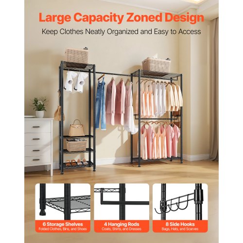 Organiserad förvaring: Denna rullande klädställning har en väl genomtänkt skiljeväggsdesign, utrustad med 6 rymliga hyllor, 4 hängstänger och 8 krokar, vilket ger gott om förvaring för dina kläder, skor, väskor, förvaringslådor och mer.