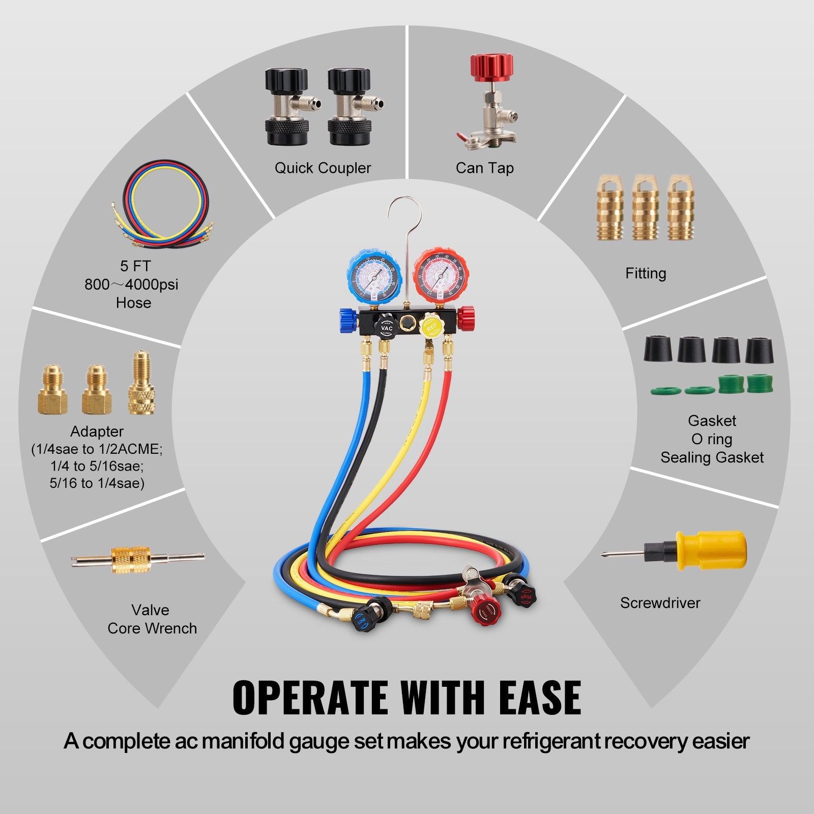 4 Way AC Gauge - AC Manifold Gauge Set for R134A R22 R12 R410A Refrigerant, Freon Gauge with 5 Feet Hoses, Couplings, Can Faucet Works on Car Auto Freon Charging and Evacuation