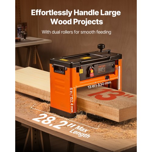 Matningssystem med dubbla rullar: Robusta dubbla rullar matar fram brädor med precision, vilket minskar vibrationer och uppriktningsproblem för felfritt raka snitt. Tillsammans med tre vassa HSS-blad ger denna tjocklekshyvel glasklara kanter fria från flisor.