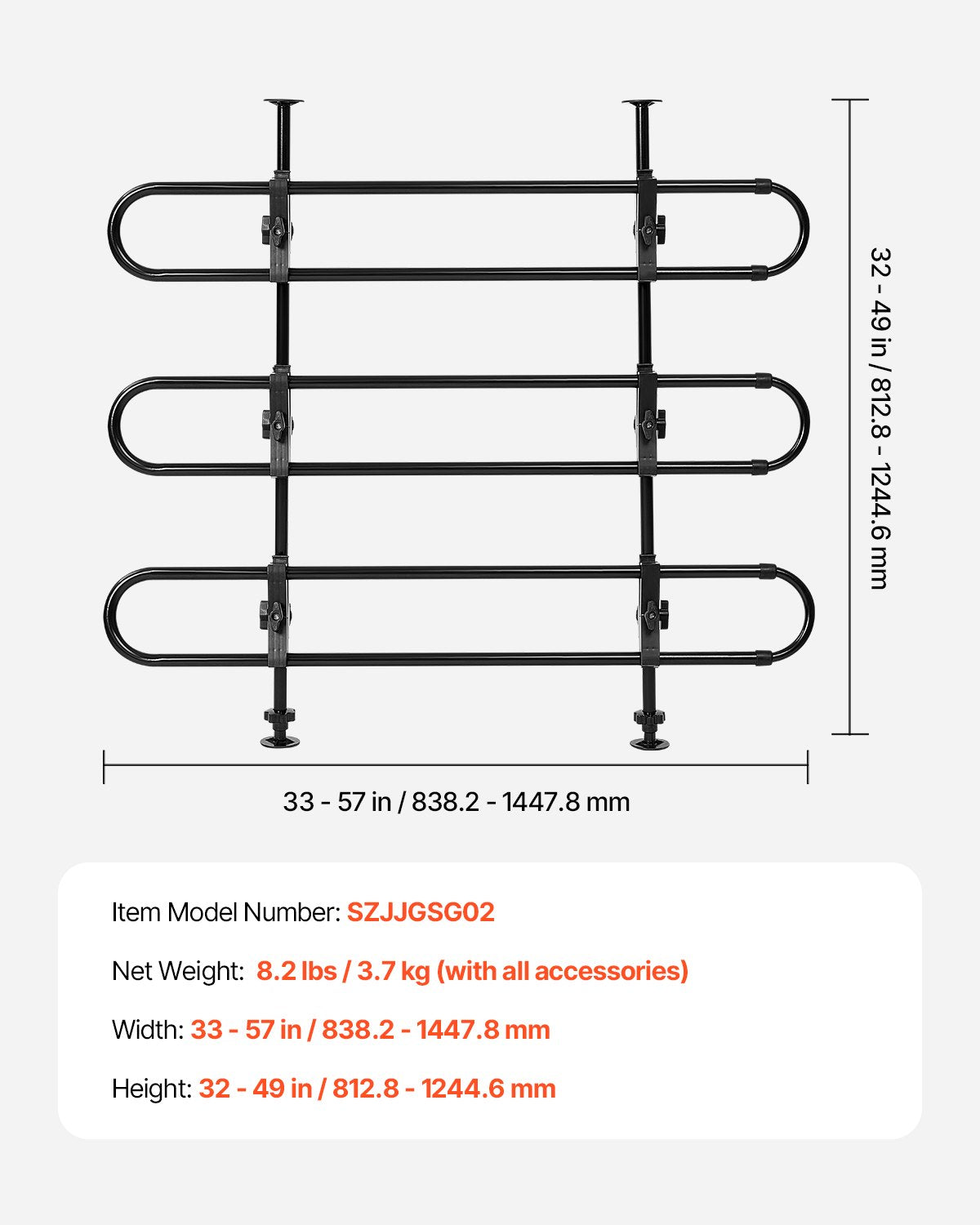 Adjustable: This dog car barrier is adjustable in both width (33-57 inches / 838.2-1447.8 mm) and height (32-49 inches / 812.8-1244.6 mm), making it suitable for cars, coupes, SUVs and more.